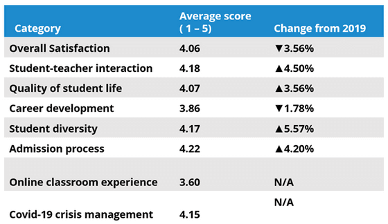 Still, student satisfaction remains at a high overall level of 4.06 out of 5. Student satisfaction with their online classroom experience (3.60) has been not at par with traditional learning, but there are exceptions. Students are generally satisfied with how universities have managed the COVID crisis (4.15).