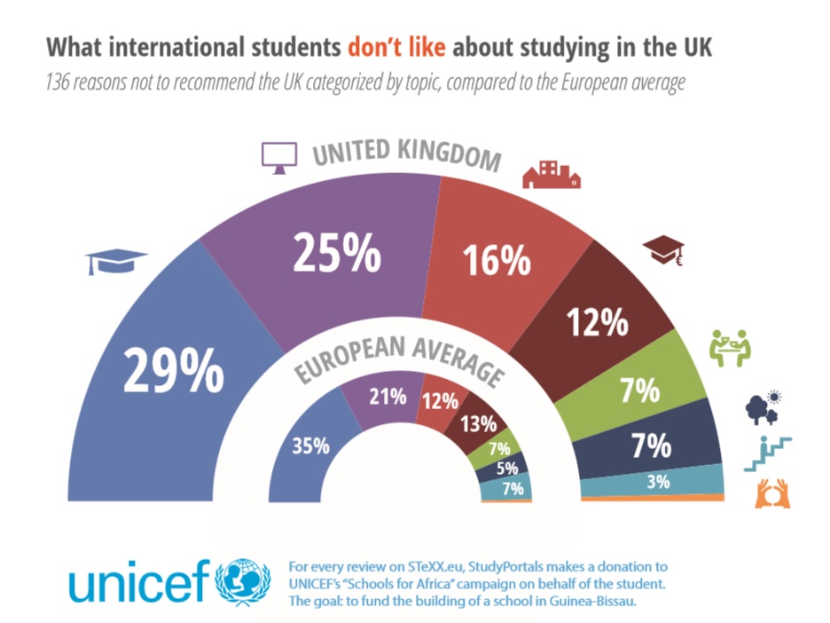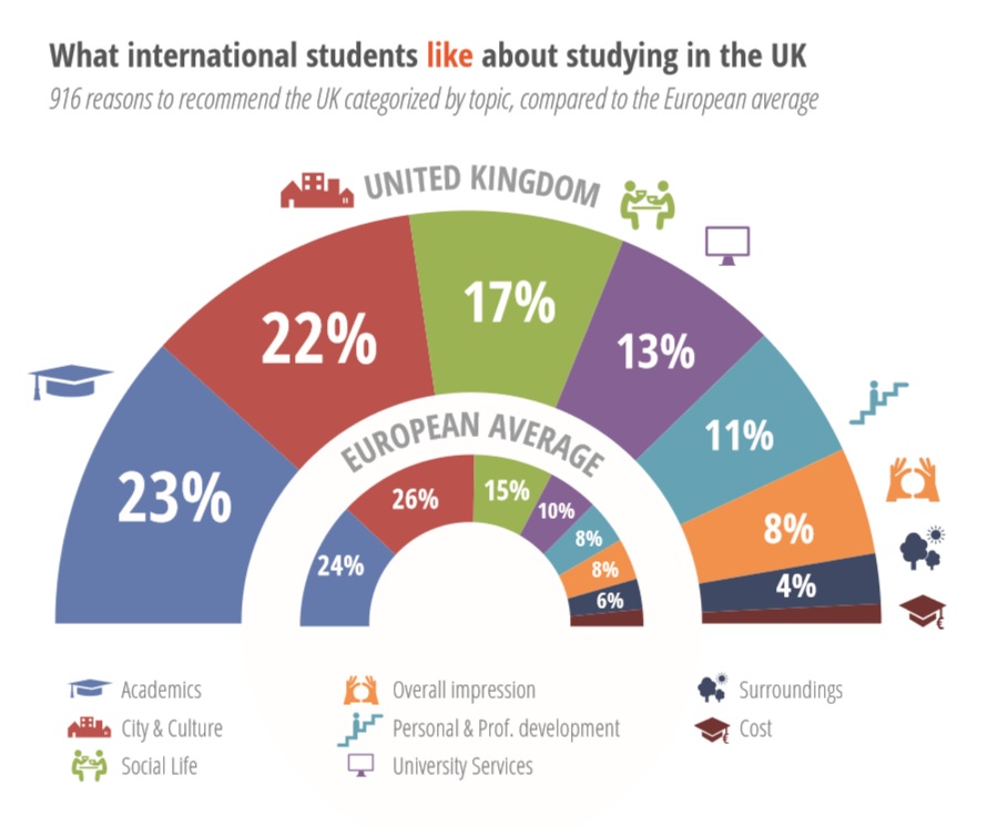International students in the UK are pleased mostly with the vibrant social life. Although they do enjoy British cities, they do not comment on t this element as positively as international students in other European countries. British universities receive most complaints about academic aspects, accommodation, and services provided by the university which are the biggest development points.